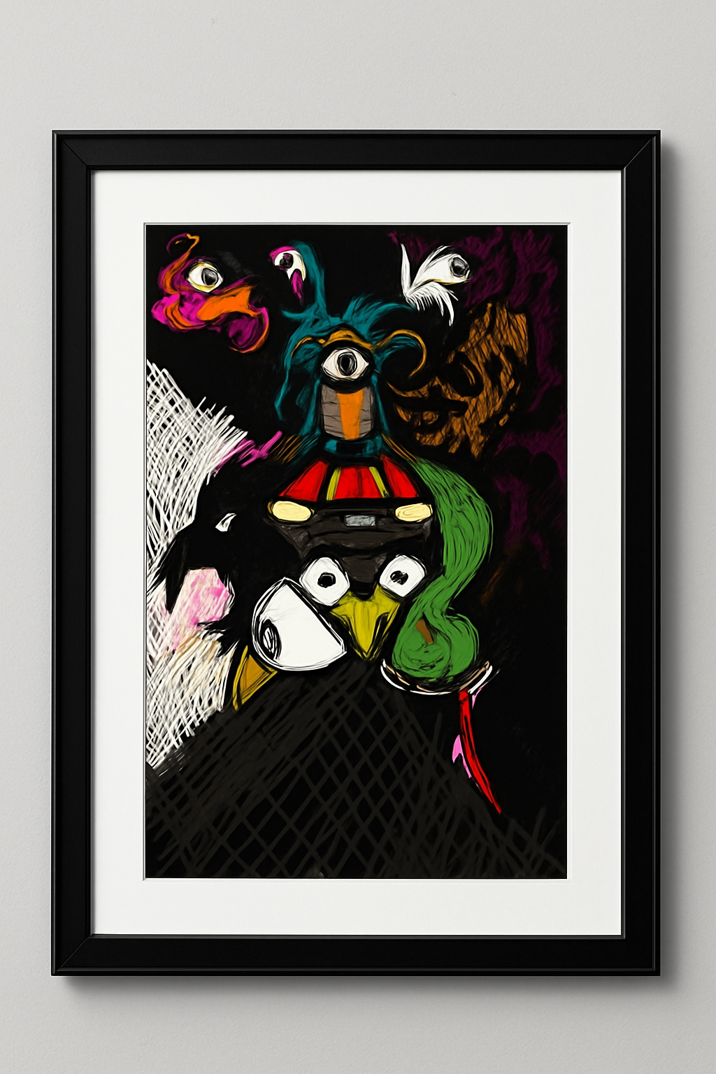 Un intreccio di istinti, colori e creature che si sovrappongono senza regole. Gli occhi osservano e si confondono, le forme si trasformano, tutto nasce e si muove nel buio. Non c’è ordine, solo sopravvivenza e immaginazione.